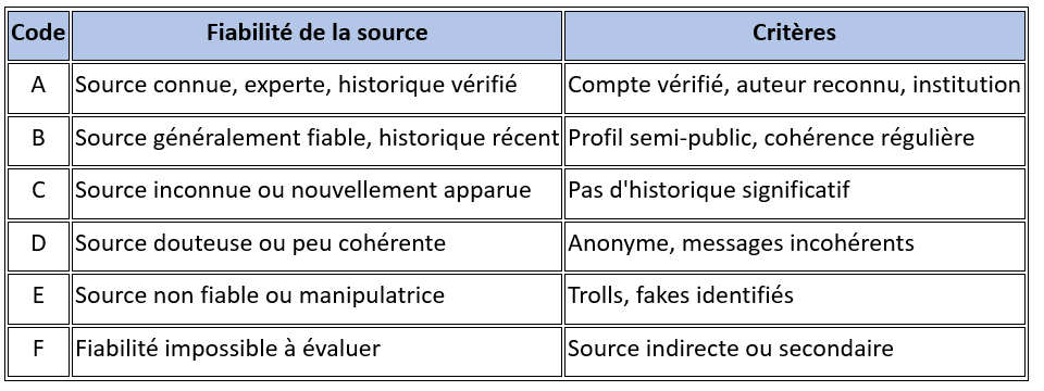 À l’heure où l’OSINT devient un vecteur central de renseignement et d’information, la maîtrise de la cotation s’impose comme un levier de fiabilité, de traçabilité et de prise de décision rapide. Dans le cadre du traitement d’une investigation en sources ouvertes, la cotation des informations constitue une étape cruciale située après leur exploitation et avant leur fusion et analyse. Pour cela, les doctrines militaires (OTAN et TTA 150) proposent d’évaluer systématiquement deux paramètres fondamentaux : la fiabilité de la source (échelle A à F) et la véracité de l’information (échelle 1 à 6).