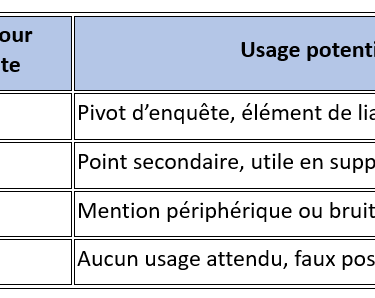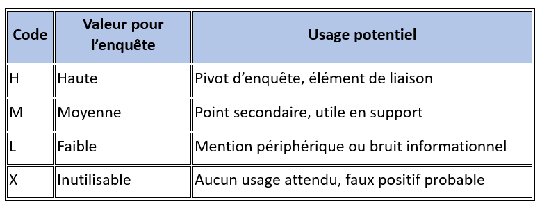 Au-delà de la qualité intrinsèque de la source et de l'information, l’analyste doit également évaluer l’utilité concrète de cette information dans le cadre de l’enquête en cours. Certaines données très fiables peuvent n’avoir qu’un intérêt secondaire, tandis qu’une information douteuse peut, bien exploitée, ouvrir une piste stratégique (cf exemples en Annexes). Cette cotation opérationnelle permet de hiérarchiser le traitement des informations et de gérer les priorités analytiques.