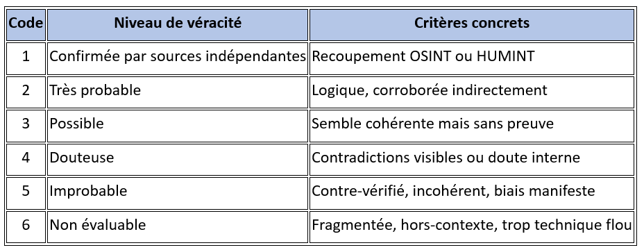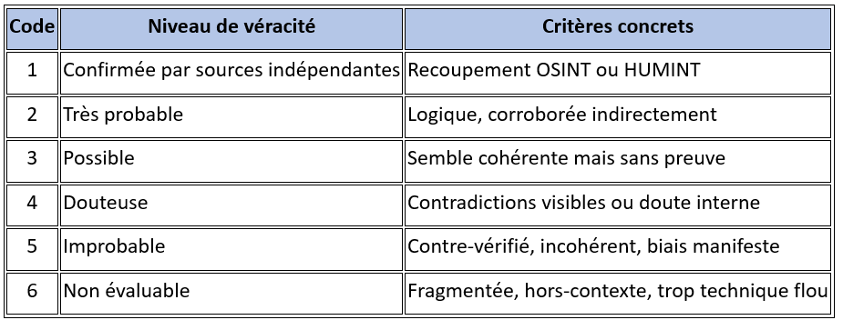 En structurant l’analyse autour de trois axes — la source, la véracité, et la valeur opérationnelle — cette méthode fournit une grille de lecture cohérente, évitant à l’analyste de se perdre dans des intuitions floues ou dans la surcharge d’information typique du renseignement moderne. Elle n’a pas pour objectif de mathématiser une réalité fondamentalement qualitative, mais bien de standardiser les jugements sans les figer. C’est une méthode qui cadre sans contraindre.