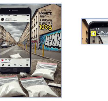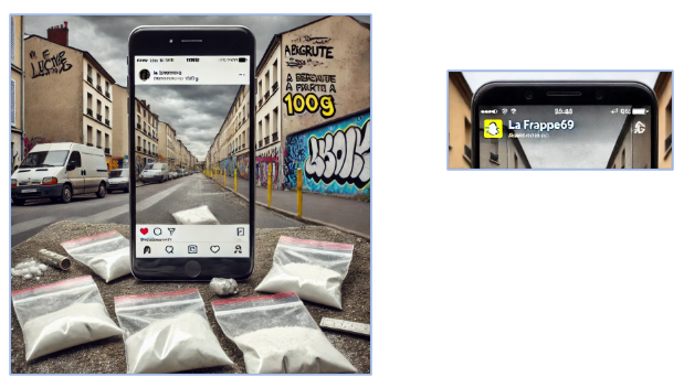 Contexte : Une cellule OSINT territoriale surveille les réseaux sociaux dans le cadre d'une enquête sur un trafic de cocaïne structuré autour d’un point de deal en banlieue lyonnaise. Un compte Snapchat anonymisé, "@Frappe69", publie une vidéo montrant plusieurs sachets conditionnés, accompagnés d’un message : “La livraison est ouverte – à partir de 100g”. L’arrière-plan montre brièvement un mur tagué reconnaissable.