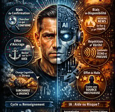 La qualité d’une production OSINT dépend moins de l’abondance des données ouvertes que de la capacité de l’analyste à raisonner de manière critique sous incertitude, souvent sous pression et en environnement potentiellement adversarial. Il distingue clairement heuristiques, biais cognitifs, erreurs et manipulation, afin d’adapter les contre-mesures à chaque type de vulnérabilité. L'article identifie ensuite les biais les plus opérationnels en OSINT (confirmation, disponibilité/saillance, récence, ancrage, « répétition ≠ corroboration », halo/autorité) et montre comment la charge cognitive, le stress et les dynamiques de groupe aggravent ces dérives, favorisant clôture prématurée et sur-pondération de signaux spectaculaires. La réponse proposée est une opérationnalisation plus rigoureuse du cycle du renseignement par la traçabilité (hypothesis log, plan de contradiction, grilles d’évaluation, comparaison structurée d’hypothèses, journal de décision, relecture critique). Enfin, l’article offre une lecture ambivalente de l’IA : utile pour le tri, l’extraction et la détection de patterns, mais risquée dès qu’elle induit surconfiance, ancrage sur la sortie machine et défaut de calibration, en particulier pour l’attribution et l’explication causale.